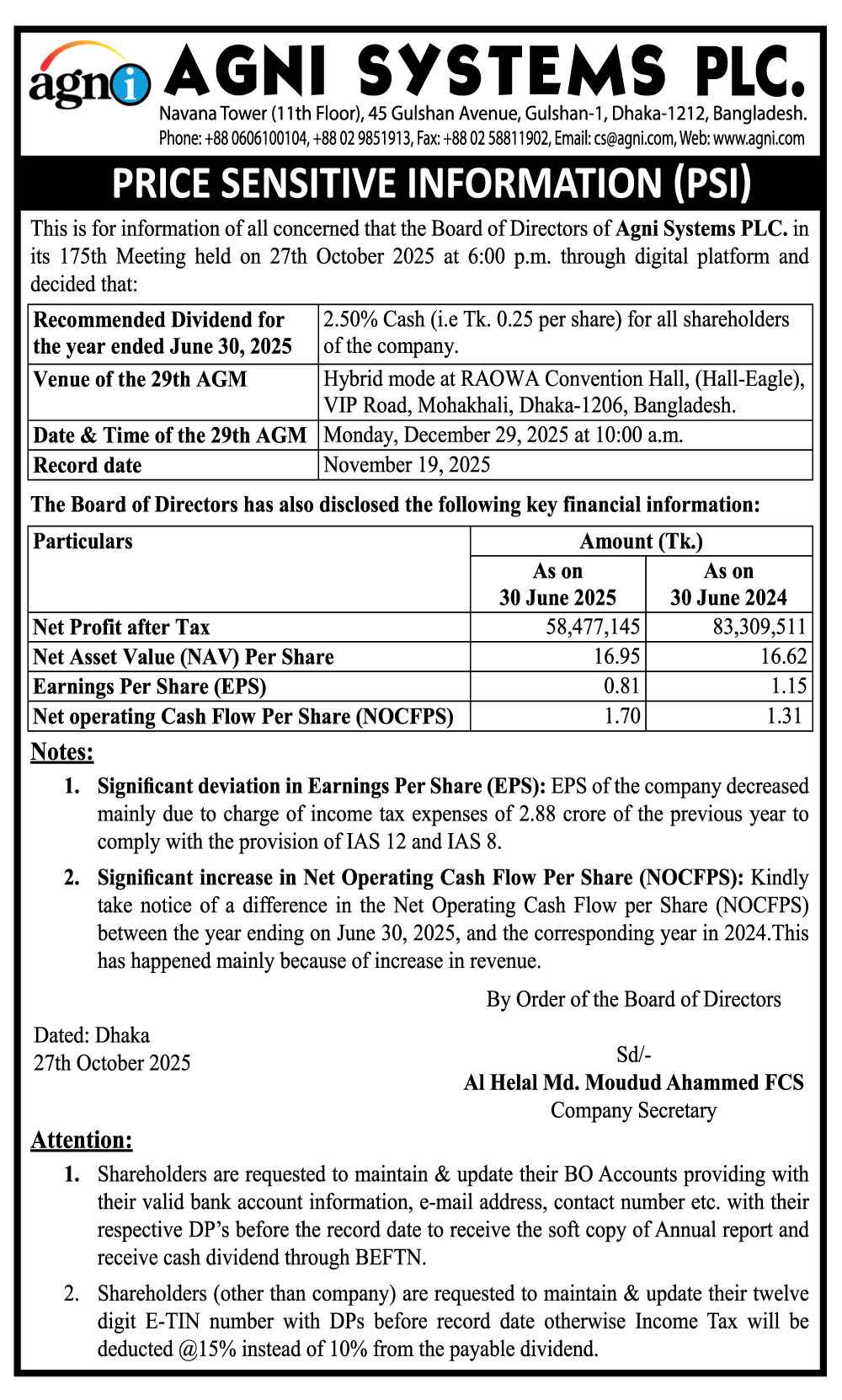 Price Sensitive Information of Agni Systems PLC.