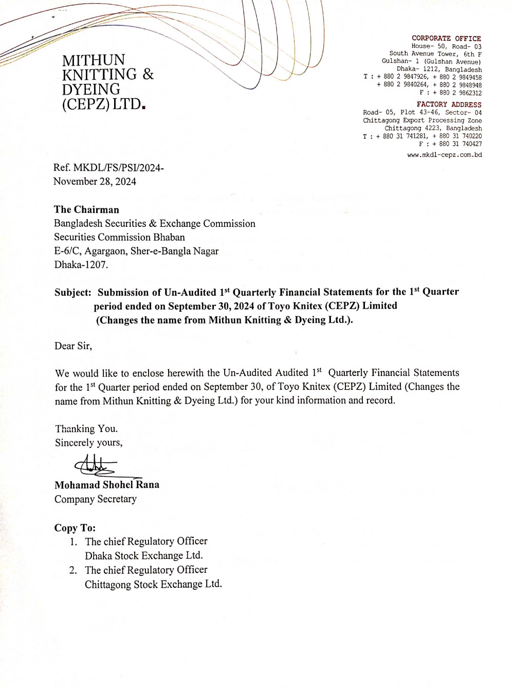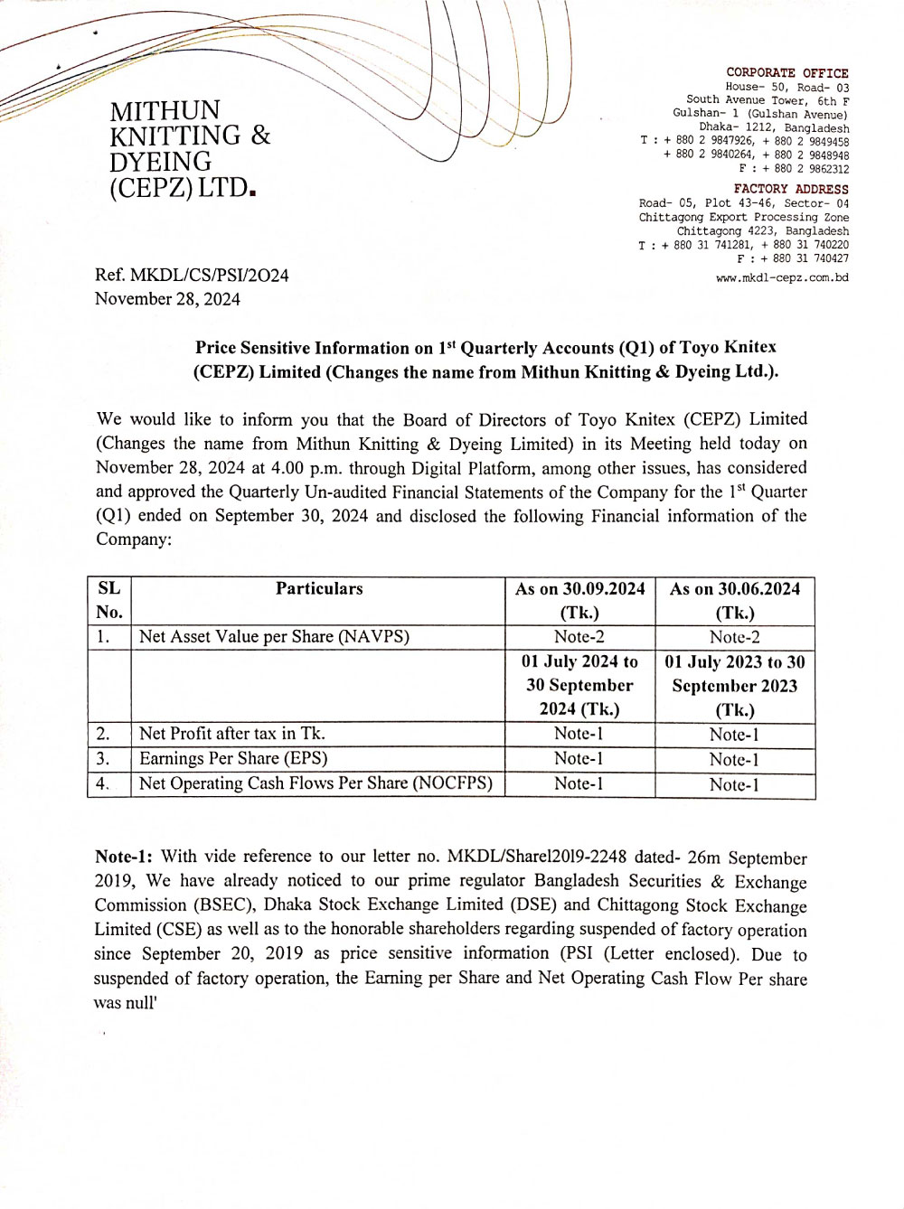 price sensitive information of mithun knitting & daying (CEPZ) limited