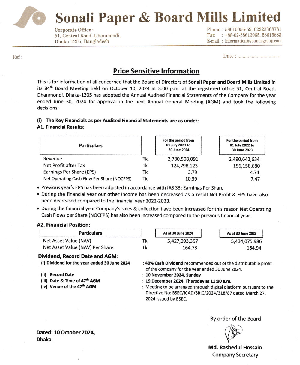 price sensitive information of sonali paper